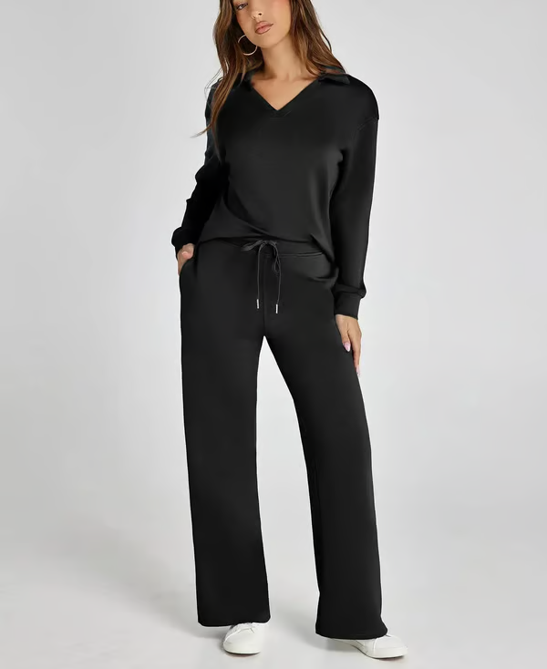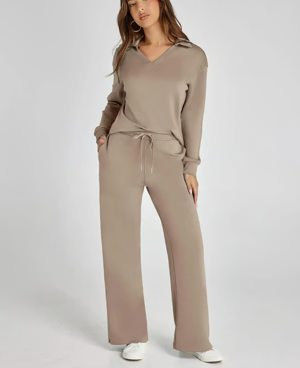 De sweatset is ontworpen met een sportieve col, V-hals en hoge zoom, broek met hoge taille en trekkoord, trekkoord voor een pasvorm op maat met een losse pasvorm die wijde benen onthult, hoge zoom zorgt voor extra bedekking op de rug, 4-way stretch voor gemakkelijk bewegen.De wijde broek met hoge taille is perfect om je lange benen te accentueren en je lange figuur te showen. De oversized pasvorm is gemakkelijk in laagjes te dragen en gaat de hele dag mee. Maak het jezelf de hele dag comfortabel!